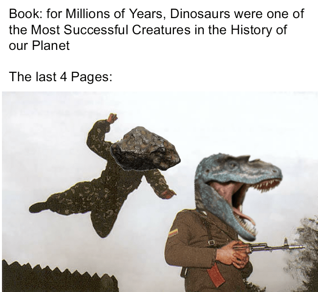 T-Rex Chase - Part 6- | Jurassic World Fan dinosaur movie in Real Life || 2021 yara film, T-Rex Chase - Part 6- | Jurassic World Fan dinosaur movie T Rex Chase - Part 4- Jurassic World Fan dinosaur movie in Real Life . We Have got 15 pics about T Rex Asteroid Meme images, photos, pictures, backgrounds, and more. In such page, we additionally have number of images out there. Such as png, jpg, animated gifs, pic art, symbol, blackandwhite, images, etc. "Bang Lari Bang Ada Meteor!\ud83d\ude11\ud83d\uddff#memes #shorts #meteor", masa cuma liat langsung pergi. subscribe dulu dong biar gua tambah semangat terus biki konten,kalo udah subscribe . "The Day the Dinosaurs Died \u2013 Minute by Minute", DISCOVER ANCIENT WORLDS Peek into the past and learn about dinosaurs and other amazing creatures: https://kgs.link/dino ..
